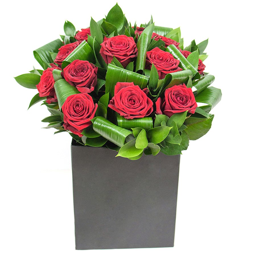 Enhance any environment with our beautiful bouquet of red roses, enriched by lush aspidistra leaves and graceful ruscus. This unique design brings style and elegance to your space.